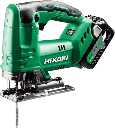 HiKOKIの最新ジグソー。「無段変速ダイヤル」で0〜3,400min⁻¹の回転数を無段階調整可能。新機能「ソフトスタート」はトリガー操作に対してゆっくり回転が立ち上がり、切り始めのブレを防止。ベースプレートは45度まで傾斜可能で、角度切りにも対応。マルチボルト対応で36Vバッテリーも使用可能です。